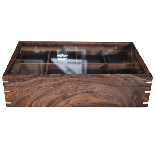 Opening the lid reveals an eight-section interior, neatly divided with Walnut partitions to keep each watch securely in place. A transparent viewing panel in the lid allows the entire collection to be admired without opening the box, offering both convenience and protection.