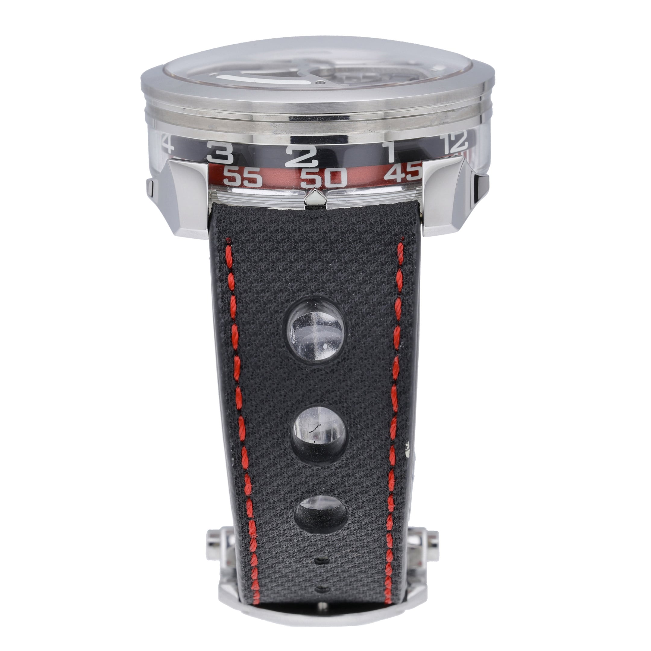 The M.A.D.1 features a horizontal time display using rotating cylinders rather than a traditional dial. Its bold case architecture and industrial styling set it apart from conventional watches. The automatic movement drives the lateral indication system with visual drama. This model appeals to collectors seeking originality and mechanical theatre.