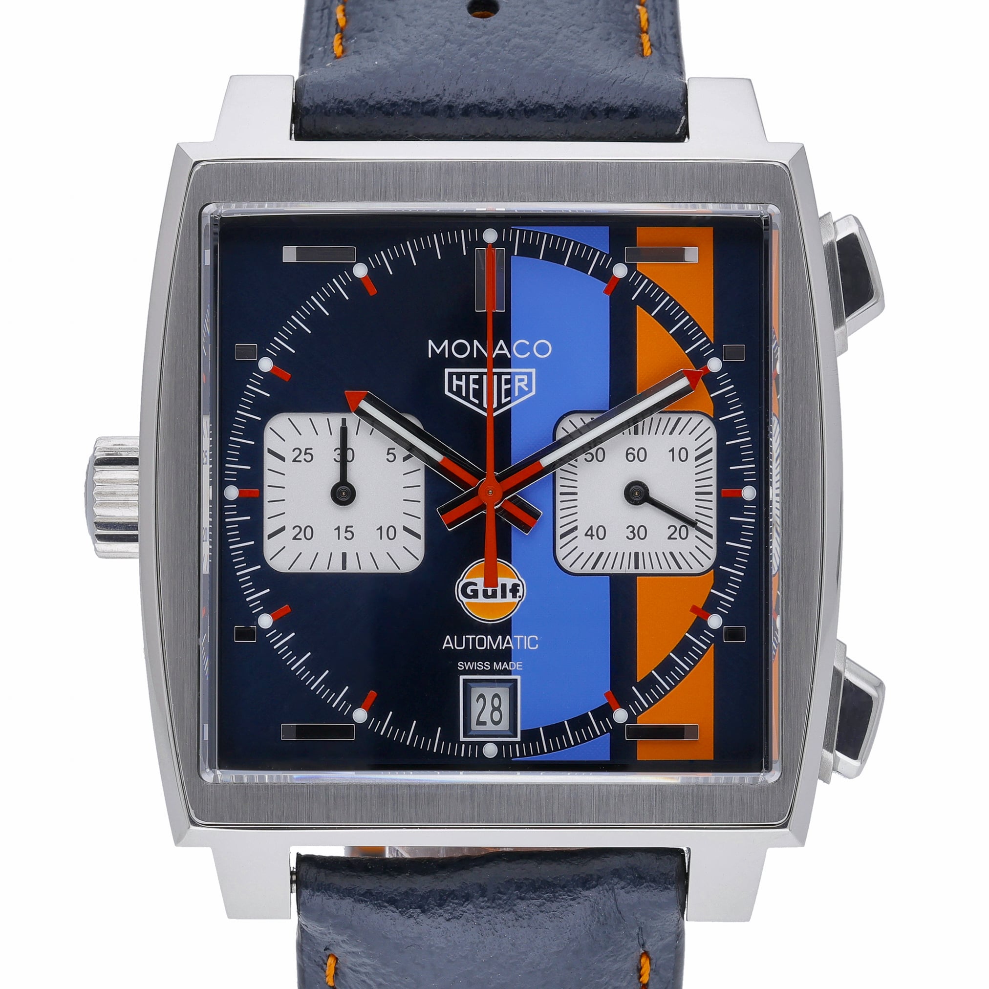 The Monaco collection represents a landmark innovation within TAG Heuer watches, first introduced in 1969 as one of the earliest square-cased automatic chronographs. Its unconventional case shape and bold dial layout distinguished it from traditional round chronographs of the era, making it an instantly recognisable design within the world of sports watchmaking.