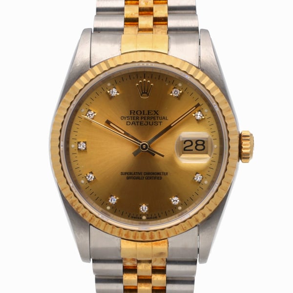 This is the Rolex Datejust, 16233 is a timeless classic. Ocation to your look. This model comes with an Automatic Movement, and it is in Excellent condition, with an Oysterclasp, a Fluted Bezel, and a 36mm Case Size. For extra convenience and peace of mind, this watch comes with a 2 Year Warranty, Original Papers, and a 14 Day Return Policy. This Rolex Datejust is a Gents watch, with a Champagne Dial Colour, Mineral Glass, a Steel & Yellow Gold Case Material and Bracelet Material, and a Jubilee Bracelet Type. It is Water Resistant up to 100M, and comes with an Original Green Tag. It is also set with Diamonds for an extra touch of luxury. With Next Day Delivery and an original Year of Manufacture of 1991, this is a great addition to any watch collection.