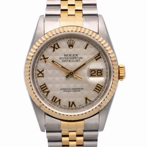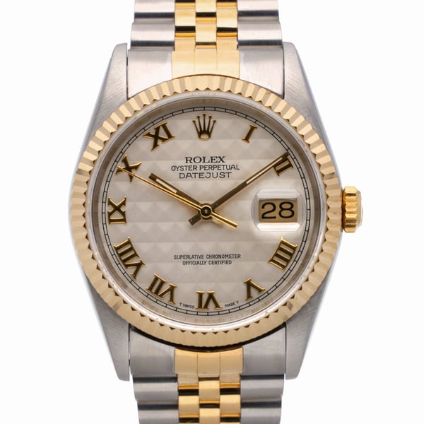 Pre-owned Rolex Datejust 16233 with 36mm Steel & Yellow Gold case and White dial. Good condition.