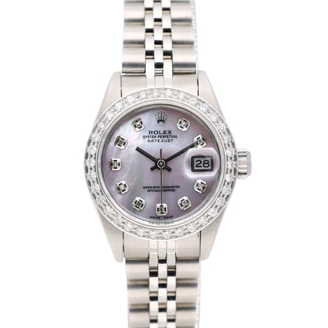 This beautiful ladies ROLEX Date is in excellent condition and comes in a 26mm Oystersteel case. The case is set with a diamond bezel and a white MOP dial covered by a mineral glass. The bracelet is Oystersteel Jubilee with an Oysterclasp for added security. The watch is powered by an Automatic movement and is water resistant up to 100M. This Rolex Date also comes with a 14 Day Return Policy, 2 Year Warranty and Authenticity Papers. This is an excellent opportunity to own a beautiful ROLEX Date in BQ Ref #43846 and with Next Day Delivery, you can have this timeless piece on your wrist in no time!