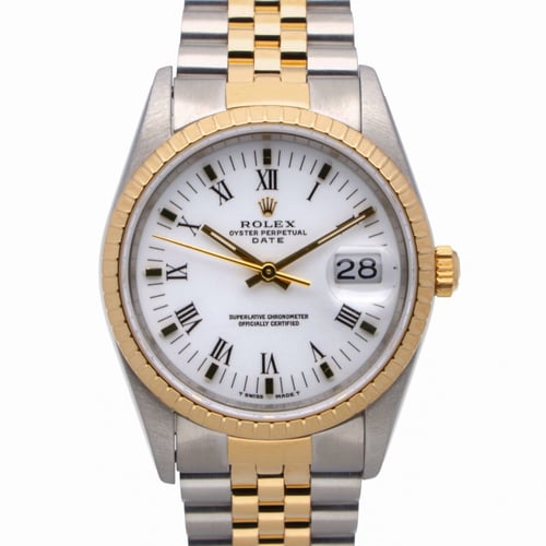 This exquisite Rolex Date watch is crafted from a combination of stainless steel and yellow gold and features a white batton dial with mineral glass front. It has a 34mm case size and fastens with an Oysterclasp bracelet made from stainless steel and yellow gold. It is in excellent condition and comes with original papers, box and green tag. This model is powered by an automatic movement and is water resistant up to 100M. It is covered by a 2 year warranty from the date of manufacture and comes with a 14 day return policy. Enjoy next day delivery of this stunning timepiece.