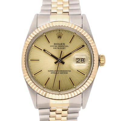 This Rolex Datejust is an iconic timepiece from 1984 that is in good condition. The 36mm steel and yellow gold case houses an automatic movement and a plexi glass to protect the champagne dial. It comes with a jubilee bracelet in steel and yellow gold as well as an oysterclasp for added comfort and security. The diamond-set bezel adds a touch of sparkle and elegance to the watch. This timepiece also has a next day delivery, a 14 day return policy, an authenticity paper and a 2 year warranty from the date of purchase. This stunning vintage Rolex Datejust is perfect for any occasion and is the perfect addition to any collection.
