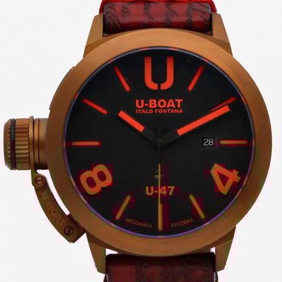 The U-Boat Classico 47 9017 is a modern classic watch with a timeless design. It is in excellent condition, and comes with a 2 Year Warranty from the date of manufacture. The 47mm case is made from bronze, and is covered with a sapphire crystal glass, making it 10 ATM water resistant. The black dial contrasts beautifully with the leather bracelet, and is secured with a pin buckle clasp. This watch comes with its original papers, and a box. With next day delivery, a 14 day return policy and no diamonds set, this watch is perfect for any occasion.