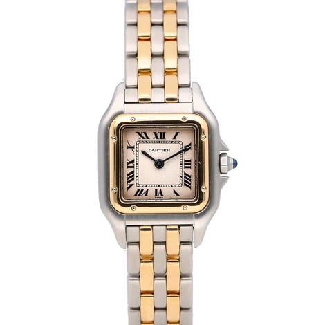 This stunning ladies Cartier Panthere watch is a must-have for any watch collector. With a steel and yellow gold case and bracelet, a white Roman dial, folding clasp and quartz movement, this watch is as beautiful as it is practical. The watch is in good condition and comes with a 2 year warranty, authenticity papers, box and mineral glass. It is also water resistant up to 100M and has a 14 day return policy. Delivery is available the next day. The case size is 22mm, making it the perfect size for both everyday wear and special occasions. An elegant and timeless piece, this Cartier Panthere watch is the perfect addition to any watch collection.