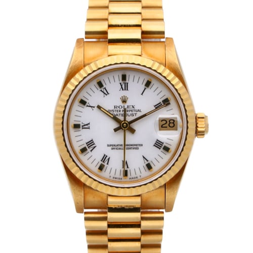This stunning Rolex Datejust watch is a timeless classic. Crafted from 18ct yellow gold, it has a concealed clasp and a white Roman dial with a fluted bezel. The case size of 31mm and the mineral glass ensures it is comfortable to wear while also providing durability and protection. Powered by an automatic movement, this watch is in excellent condition and comes with a 2 year warranty, original papers, and a 14 Day Return Policy. The water resistant rating of 100M makes it ideal for everyday wear and with Next Day Delivery, you can enjoy it in no time. With its classic style, this Rolex Datejust is the perfect addition to any collection.
