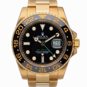 Pre-owned Rolex Gmt-Master Ii 116718LN with 40mm 18ct Yellow Gold case and Black dial. Excellent condition.