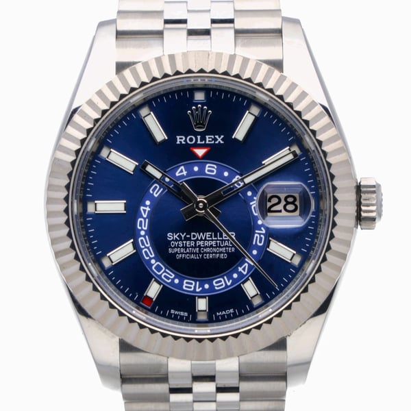 Pre-owned Rolex Sky-Dweller 326934 with 42mm Steel & White Gold case and Blue dial. Excellent condition.