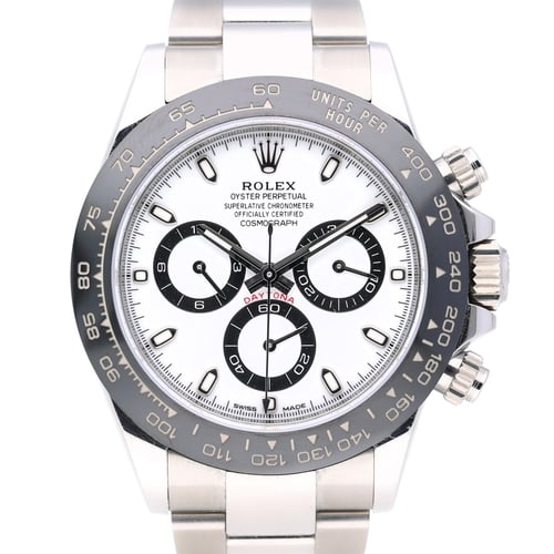The Rolex Daytona, model no. 116500LN, is an automatic watch in excellent condition. Manufactured in 2022, it carries a 5-year manufacturer's warranty. Featuring an Oysterlock clasp and a tachymetric scale bezel, this gents model is 100M water resistant. The case is made of Oystersteel, size 40mm, and covered with mineral glass. The white chronograph dial is complemented by an Oystersteel bracelet. The watch comes with a new warranty card, a white tag and is delivered in a box. This Rolex Daytona offers a 14-day return policy and next day delivery.