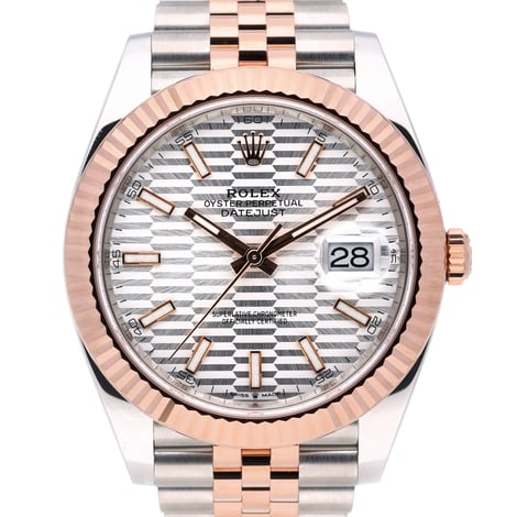 Introducing the impeccable ROLEX DATEJUST 41. Crafted by the renowned brand Rolex, this watch exudes luxury and sophistication. With a Model Number of 126331, this watch is in excellent condition and is accompanied by a 5 Years Manufacturers warranty that runs from the date of manufacture, providing peace of mind for years to come. The 41mm case is made of a combination of steel and rose gold, while the Fluted bezel adds a touch of elegance. The silver dial, with its Fluted design, is complemented by a steel and rose gold Jubilee bracelet, secured by an Oysterclasp. This watch is also water-resistant up to 100M, making it perfect for any occasion. The Datejust 41 comes with a box and a new warranty card, and is delivered with next day shipping.