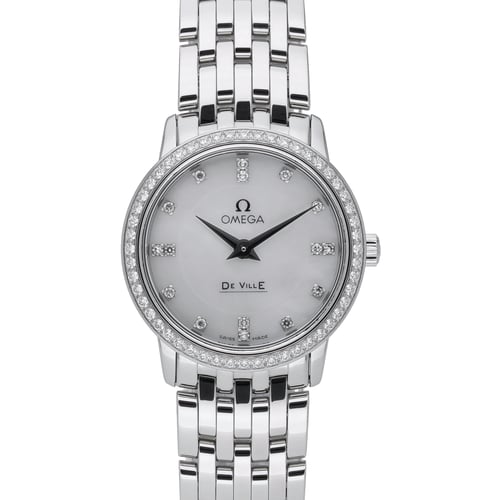 Elegant and timeless, this ladies’ Omega De Ville Prestige (ref. 413.15.27.60.55.001; BQ Ref 48374) features a 27mm stainless steel case with a diamond-set bezel and a luminous mother-of-pearl diamond dial. Powered by a reliable quartz movement, it pairs everyday precision with refined style. The steel bracelet with folding clasp offers secure, comfortable wear, while the sapphire crystal and 30M water resistance add practical durability. Manufactured in 2011 and presented in excellent condition, this piece is supplied with its original box and papers. Enjoy peace of mind with a 2 Year Warranty, plus a 14 Day Return Policy for added confidence. Next Day Delivery available.