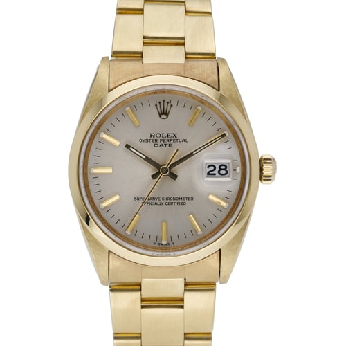 Rolex Date 15505 (BQ Ref 49192). A refined 1982 gents model in good condition, this classic features a 34mm gold‑plated case with plain bezel and a matching gold‑plated Oyster bracelet secured by a folding clasp. The champagne baton dial is protected by period‑correct plexi glass, while an automatic movement delivers reliable everyday performance. Supplied with its box, this vintage Rolex balances timeless style with wearable versatility. Includes a 2‑Year Warranty, 14‑Day Return Policy, and Next Day Delivery for a seamless purchase experience.