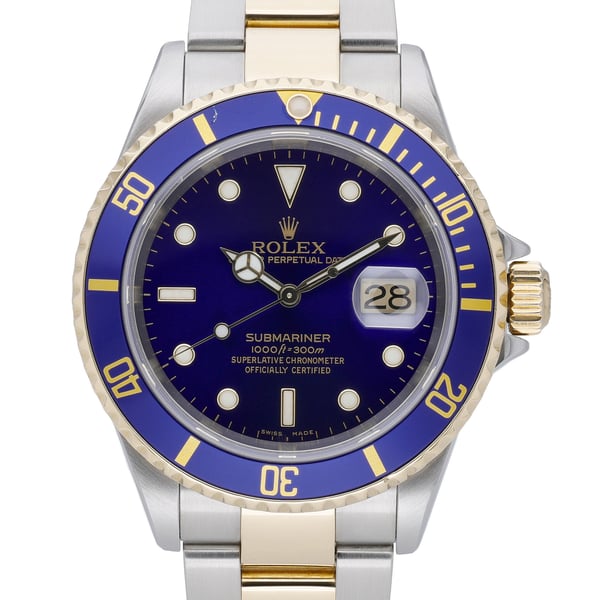 Presenting the Rolex Submariner 16613LB (BQ Ref 49887), a distinguished 2004 two-tone diver in excellent condition. Powered by a reliable automatic movement, this 40mm model pairs a Steel & Yellow Gold case with a matching Oyster bracelet and secure Oysterlock clasp. The plain blue dial sits beneath scratch-resistant sapphire crystal, while a unidirectional rotatable bezel and 300M water resistance underscore its professional diving heritage. Supplied with its original box and papers, this Submariner offers both collectability and everyday versatility. Includes a 2 Year Warranty, Next Day Delivery, and a 14 Day Return Policy. A refined choice for gents seeking the iconic Submariner look with the elevated presence of yellow gold.