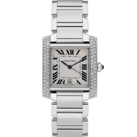 Elevate your collection with this gents Cartier Tank Francaise (Model 2302, BQ Ref 50050), a timeless 28mm steel automatic from 2001. Presented in good condition, it features a classic white Roman dial under mineral glass, a sturdy steel bracelet with folding clasp, and 30M water resistance for everyday elegance. This example includes aftermarket diamond-set detailing, adding refined brilliance to the iconic Tank silhouette. Supplied with box and backed by our 2 Year Warranty, it blends Cartier’s design heritage with reliable performance. Enjoy Next Day Delivery and a 14 Day Return Policy for complete peace of mind.