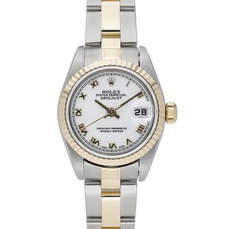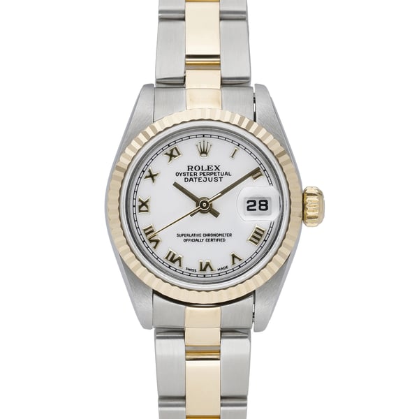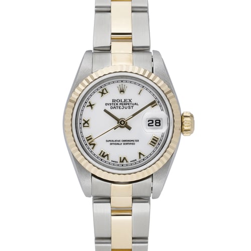 Timeless and refined, this ladies’ Rolex Datejust (Model 69173, BQ Ref 50507) pairs a 26mm steel and yellow gold case with a classic fluted bezel and crisp white Roman dial beneath durable sapphire crystal. Powered by a reliable automatic movement and presented in excellent condition, it features the iconic two-tone Oyster bracelet with folding clasp for secure, all-day comfort. Produced in 1998 and supplied with its box, this elegant Datejust offers everyday versatility with water resistance to 10 ATM. Enjoy confidence with our 2 Year Warranty, plus convenient Next Day Delivery and a 14 Day Return Policy. A sophisticated staple for any collection.