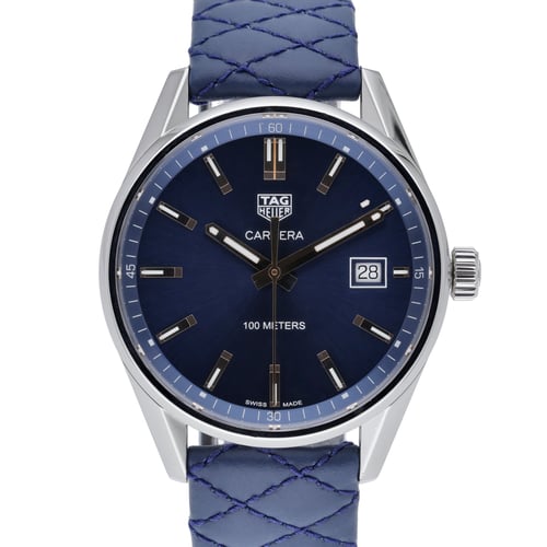 Refined and versatile, this Tag Heuer Carrera (model WAR1112) features a 39mm steel case framing a striking blue baton dial beneath durable sapphire crystal. Powered by a precise quartz movement, it offers 100M water resistance and a plain bezel, complemented by a leather strap with a secure folding clasp. Presented in excellent condition and dated 2016, this gents’ timepiece comes complete with its box and original papers for added assurance. BQ Ref 50834. Enjoy our 2 Year Warranty, Next Day Delivery, and a 14 Day Return Policy—making this modern classic a confident, everyday choice.