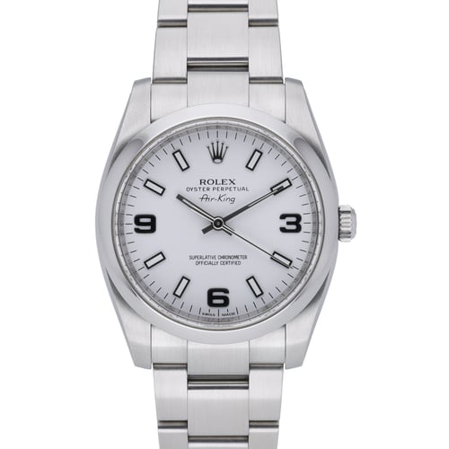 Discover the Rolex Air-King (Model 114200), a timeless 34mm midsize piece crafted in durable Oystersteel with a domed bezel and crisp white baton dial under sapphire crystal. Powered by a dependable automatic movement, this 2014 example is in excellent condition and offers 100M water resistance. It features the iconic Oyster bracelet with a secure folding clasp for everyday comfort. Supplied as a complete set with original box, original papers, and green tag. Backed by a 2 Year Warranty, Next Day Delivery, and our 14 Day Return Policy. BQ Ref: 51125.