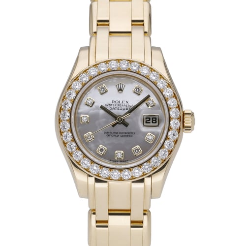 Experience the elegance of the Rolex Datejust Pearlmaster (Model 80298), a 29mm ladies’ timepiece crafted in solid 18ct yellow gold. This diamond-set classic showcases a factory diamond bezel and a mother-of-pearl diamond dial beneath scratch-resistant sapphire crystal. Powered by a precise automatic movement and water resistant to 100M, it pairs everyday reliability with refined luxury. The iconic Pearlmaster bracelet with folding clasp completes the silhouette. Presented in excellent condition, year 2001, and supplied with original box and papers (BQ Ref 51173). Includes a 2 Year Warranty, a 14 Day Return Policy, and next day delivery for your convenience.