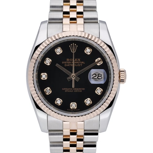 BQ Ref 51232. This Rolex Datejust 36 (model 116231) is a 2008 gents timepiece in excellent condition, blending steel and rose gold with a classic fluted bezel. Its black diamond-set dial adds refined brilliance, protected by a scratch-resistant sapphire crystal, while the smooth automatic movement ensures reliable performance. The Jubilee bracelet in matching steel and rose gold features a concealed clasp for a seamless, elegant fit. With 100M water resistance and a versatile 36mm case, this Datejust is suited to both everyday wear and special occasions. Supplied with original box, original papers, and green tag, and backed by a 2 Year Warranty, it also includes a 14 Day Return Policy for peace of mind. Next Day Delivery available.