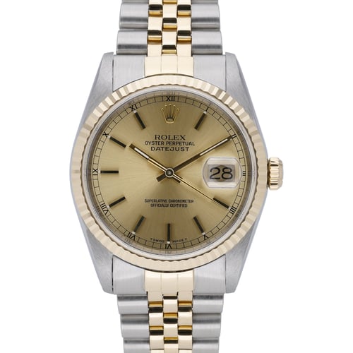 Rolex Datejust 36mm (Ref. 16233), BQ Ref 51322, in excellent condition. Crafted in steel and yellow gold, it features the signature fluted bezel, a champagne baton dial protected by sapphire crystal, and the iconic Jubilee bracelet with folding clasp. Powered by an automatic movement, this 1996 gents model delivers timeless style and dependable performance, complemented by 10 ATM water resistance. Supplied with original box and papers, and backed by a 2 Year Warranty. Enjoy next day delivery and a 14 Day Return Policy for complete peace of mind.