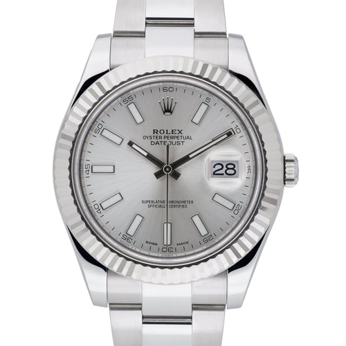 Presenting the Rolex Datejust II 41mm (Ref. 116334, BQ Ref 51300), a 2015 gents timepiece in excellent condition. Crafted in steel and white gold with the signature fluted bezel, it showcases a refined silver dial under scratch-resistant sapphire crystal and is powered by a reliable automatic movement. The robust Oystersteel Oyster bracelet with folding clasp offers comfort and durability, while 100m water resistance adds everyday versatility. This complete set is supplied with its original box, papers, and green tag. Covered by our 2 Year Warranty, with Next Day Delivery and a 14 Day Return Policy for your peace of mind.