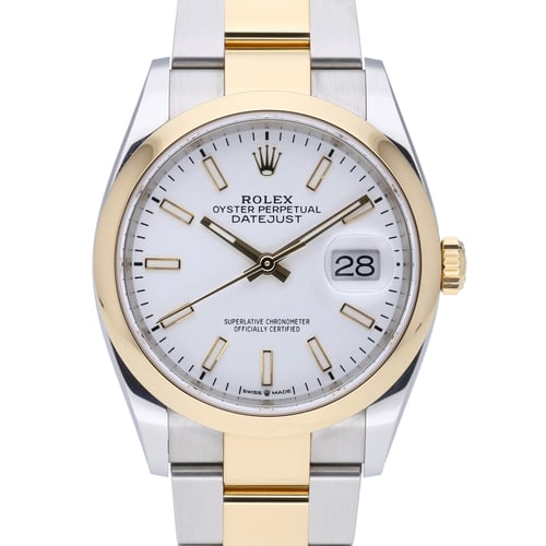 Elevate your collection with this Rolex Datejust 36 (ref. 126203), crafted in steel and yellow gold and presented in excellent condition. The crisp white baton dial sits beneath a scratch-resistant sapphire crystal, framed by a smooth bezel and paired with the iconic two-tone Oyster bracelet and Oysterclasp. Powered by a precise automatic movement and water-resistant to 100m, this 2021 model blends everyday versatility with timeless sophistication. Supplied with Rolex box and original papers, and covered by the 5-year manufacturer’s warranty from its 2021 date of manufacture. Case size: 36mm. Delivery: Next Day Delivery available. Returns: 14-day return policy. BQ Ref: 51379.
