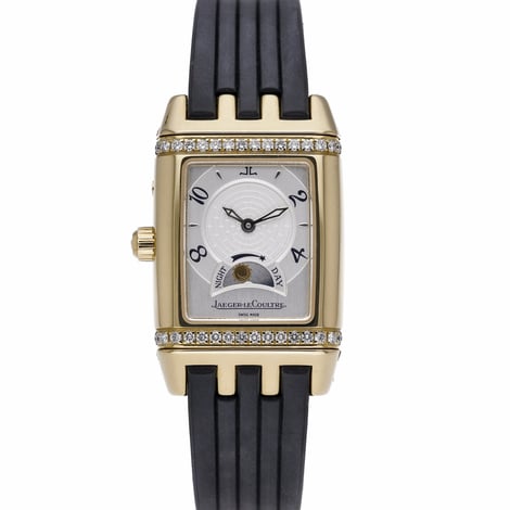 Elegant and iconic, this ladies’ Jaeger‑LeCoultre Reverso (Model 296.1.74, BQ Ref 51366) pairs Art Deco lines with modern luxury. The 24mm x 38mm rectangular case in 18ct yellow gold features a plain bezel with diamond-set accents, framing a crisp white Arabic dial beneath sapphire crystal. Powered by a manual‑wind movement, the reversible case delivers the signature Reverso versatility, while a rubber bracelet with a folding clasp offers contemporary comfort and secure wear. Presented in excellent condition and dated 2007, this timepiece is supplied with its original box and papers and is backed by our 2 Year Warranty. Enjoy Next Day Delivery and the reassurance of our 14 Day Return Policy.