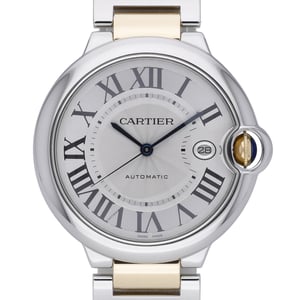 Elevate your collection with the Cartier Ballon Bleu (Model 3001), a 42mm automatic in excellent condition. Crafted in stainless steel with a smooth bezel, it presents a silver dial with classic Roman numerals beneath sapphire crystal. The two-tone steel and yellow gold bracelet secures with a folding clasp for refined comfort. Manufactured in 2009 and water resistant to 3ATM, this gents’ timepiece embodies the elegant contours that define the Ballon Bleu. Supplied with box, a 2 Year Warranty, and the reassurance of a 14 Day Return Policy. Available with Next Day Delivery. BQ Ref: 51365.