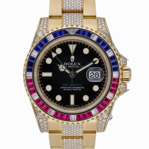 Elevate your collection with this Rolex GMT-Master II (Ref. 116758SARU), a 40mm gents model crafted in 18ct yellow gold and presented in excellent condition. Its black dial sits beneath scratch-resistant sapphire crystal, framed by a brilliant diamond-set bezel. Driven by Rolex’s automatic movement with signature dual-time functionality, it is fitted to an 18ct yellow gold Oyster bracelet secured by a folding clasp and offers 100M water resistance. Year 2007. Supplied with Rolex box and original papers (BQ Ref: 51503). Enjoy peace of mind with our 2 Year Warranty, 14 Day Return Policy, and Next Day Delivery.