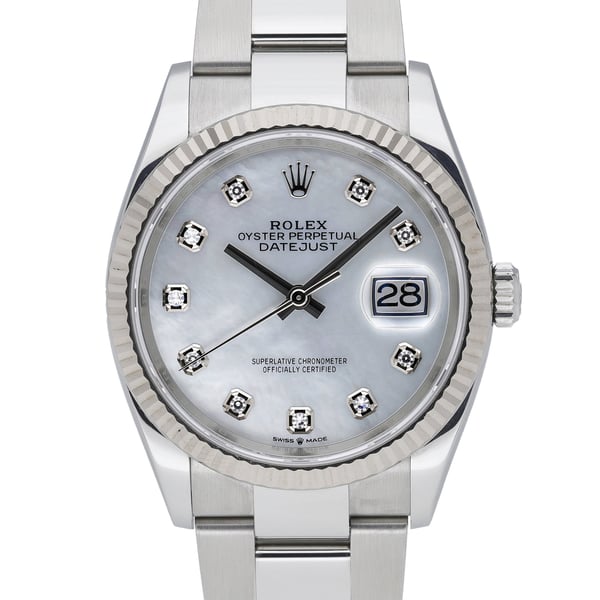 Rolex Datejust 36, ref. 126234 (BQ Ref. 51515), in excellent condition from 2020. Crafted in steel and white gold with a signature fluted bezel, this 36mm classic features a stunning mother‑of‑pearl diamond‑set dial under scratch‑resistant sapphire crystal. Powered by a precise automatic movement, it’s paired with an Oystersteel Oyster bracelet and secure Oysterclasp for everyday comfort. Water resistant to 100M, this gents’ model balances elegance and versatility effortlessly. Supplied with original box, papers, and white tag. Includes the original 5‑year manufacturer’s warranty running from the 2020 date of manufacture. Enjoy next day delivery and a 14‑day return policy.