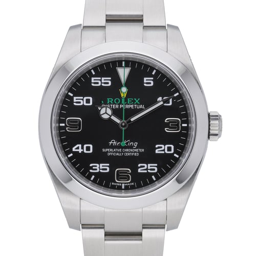 Discover the Rolex Air-King, reference 116900, a 40mm Oystersteel classic pairing precision with everyday versatility. Its black Arabic dial with prominent minute scale is protected by scratch-resistant sapphire crystal, framed by a smooth bezel, and driven by a reliable automatic movement. The robust Oyster bracelet with folding clasp ensures comfort and security, while 100m water resistance adds practical confidence. Manufactured in 2022 and presented in excellent condition, this example comes complete with original Rolex box, papers, and white tag. Covered by the manufacturer’s five-year warranty from its 2022 date of manufacture. BQ Ref: 51541. Enjoy next day delivery and shop with confidence thanks to our 14-day return policy.