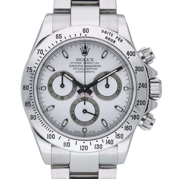 Presenting the Rolex Daytona 116520, a coveted 40mm chronograph in Oystersteel with a crisp white dial and tachymetric bezel. Powered by an automatic movement and protected by scratch‑resistant sapphire crystal, this 2008 gents’ model pairs the iconic Oyster bracelet with a secure Oysterlock clasp and offers 100M water resistance. In excellent condition, it comes complete with Rolex box, original papers, and original white tag. BQ Ref 51383. Supplied with a 2 Year Warranty, 14 Day Return Policy, and Next Day Delivery. A timeless expression of performance and precision.