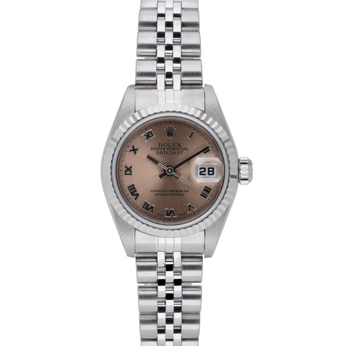 Refined and timeless, this ladies Rolex Datejust (Model 79174, BQ Ref 51512) features a 26mm steel case with a white gold fluted bezel and an elegant salmon Roman dial. Powered by an automatic movement and protected by sapphire crystal, it offers everyday assurance with 100M water resistance. The classic Jubilee bracelet in Oystersteel with a folding clasp delivers enduring comfort and style. Manufactured in 2002 and presented in excellent condition, this example is supplied with its box, original papers, and original green tag. Backed by our 2 Year Warranty, plus a 14 Day Return Policy and Next Day Delivery, this Datejust is a sophisticated addition to any collection.
