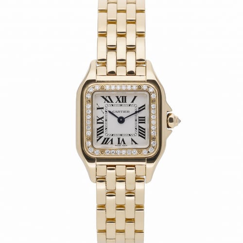 The Cartier Panthère WJPN0086 is an elegant ladies’ timepiece crafted in 18ct yellow gold, showcasing the collection’s timeless silhouette. Its 22mm x 30mm case features a diamond-set bezel and a crisp white Roman dial protected by sapphire crystal. A precise quartz movement ensures effortless reliability, while the matching 18ct yellow gold bracelet with folding clasp offers refined comfort. Water resistant to 30M and presented in excellent condition (2025), this watch is supplied with its original box and papers for complete confidence. Enjoy a 2 Year Warranty, Next Day Delivery, and a 14 Day Return Policy. BQ Ref 51509.