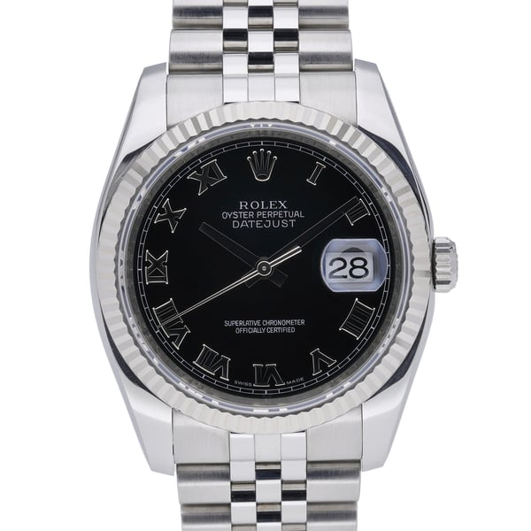 Presenting the Rolex Datejust 36, ref. 116234 (BQ Ref 51519), a 2008 gents model in excellent condition. The 36mm Oystersteel case is paired with an 18ct white gold fluted bezel, framing a black Roman numeral dial under sapphire crystal. Powered by a precise automatic movement and water resistant to 100M, this classic Datejust is fitted with a refined Jubilee bracelet and secure folding clasp. Supplied complete with Rolex box, original papers, and original white tag, and covered by our 2 Year Warranty, it’s a timeless addition to any collection. Enjoy next day delivery and a 14-day return policy for peace of mind.