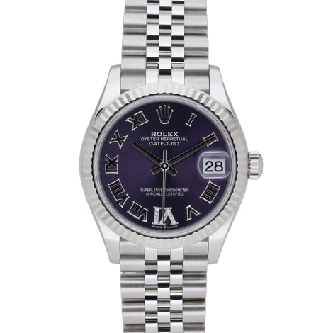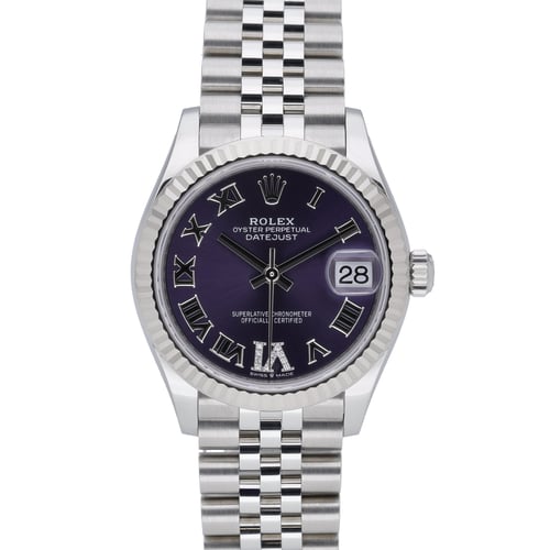 Elevate your collection with this midsize Rolex Datejust 31, model 278274 (BQ Ref 51553), presented in excellent condition. Crafted in robust Oystersteel, it features a 31mm case with a classic fluted bezel, a striking purple Roman dial enhanced with diamond-set detailing, and a durable sapphire crystal. Powered by a precise automatic movement and water resistant to 100M, it’s paired with the iconic Jubilee bracelet in Oystersteel, secured by a concealed clasp for a refined, seamless look. This 2022 example is supplied with its Rolex box, original papers, and original white tag. It benefits from the Rolex 5-year manufacturer’s warranty running from the date of manufacture (2022), offering added peace of mind. Enjoy convenient next day delivery and a 14 day return policy. A timeless, versatile Datejust that balances elegance and everyday practicality.
