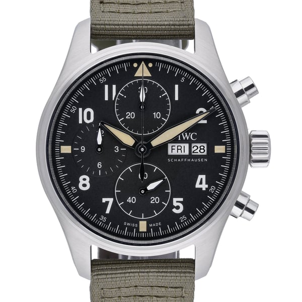 The IWC Pilot Spitfire Chronograph (IW387901) blends aviation heritage with modern precision. Presented in excellent condition, this 41mm stainless-steel model features a black chronograph dial with bold Arabic numerals, a plain bezel, and scratch-resistant sapphire crystal. Powered by an automatic movement and water resistant to 60M, it’s paired with a durable fabric strap secured by a pin buckle for everyday comfort. Year of manufacture: 2022. Supplied with original box and papers, and includes a 2-year warranty for peace of mind. BQ Ref 51622. Next Day Delivery available and covered by our 14 Day Return Policy.
