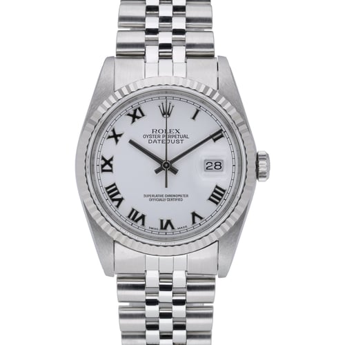 Presented in excellent condition, this 1989 Rolex Datejust (Model 16234, BQ Ref 51640) embodies timeless elegance and everyday reliability. The 36mm steel case is paired with a white gold fluted bezel, framing a crisp white Roman dial protected by sapphire crystal. Powered by an automatic movement and water resistant to 100M, it offers practicality to match its classic style. The steel Jubilee bracelet with Oysterclasp provides secure, comfortable wear. Supplied with box and backed by our 2-year warranty, this gents’ Datejust is a refined choice for both collectors and daily wear. Enjoy next day delivery and our 14-day return policy for complete peace of mind.