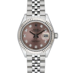 Presenting the Rolex Datejust 28 (Ref. 279174), a refined ladies’ timepiece in excellent condition from 2019. Crafted in steel and white gold, it features a signature fluted bezel and a 28mm case framing a pink, diamond‑set dial protected by sapphire crystal. The automatic movement is paired with a Jubilee bracelet in Oystersteel and a concealed clasp for an elegant, seamless fit. Water resistant to 100M, this model balances everyday versatility with timeless luxury. Supplied with original box, original papers, and the original white tag. Includes our 2 Year Warranty, 14 Day Return Policy, and Next Day Delivery. BQ Ref: 51625.