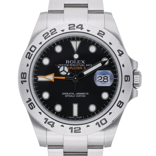 Discover the Rolex Explorer II, reference 216570, a robust 42mm tool watch crafted in Oystersteel and powered by an automatic movement. This 2017 example is in excellent condition and features a black dial under scratch‑resistant sapphire crystal, framed by a fixed 24‑hour graduated bezel for tracking day/night or a second time zone. The iconic Oyster bracelet with secure Oysterlock clasp ensures comfort and durability, while 100M water resistance equips it for everyday adventure. Supplied with its original box, papers, and white tag, this Explorer II is ready to wear and collect. Enjoy peace of mind with our 2 Year Warranty, a 14 Day Return Policy, and Next Day Delivery. BQ Ref: 51612.