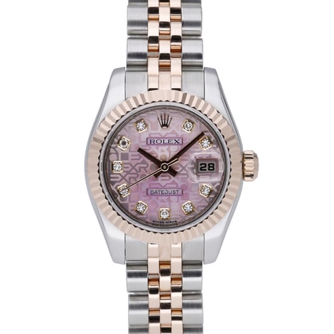 Elevate your collection with this ladies Rolex Datejust, reference 179171, in a refined 26mm steel and rose gold Rolesor case. Presented in excellent condition, it features a fluted bezel, a pink Diamond Jubilee dial, and the elegant Jubilee bracelet with concealed clasp. The automatic movement is protected by scratch-resistant sapphire crystal and delivers everyday reliability, complemented by 100M water resistance. Manufactured in 2008, this timeless classic is supplied with its Rolex box and includes our 2 Year Warranty for peace of mind. Enjoy next day delivery and a 14 day return policy. BQ Ref: 51620.
