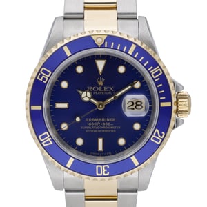 Experience a classic two-tone icon with this 1997 Rolex Submariner (ref. 16613), BQ Ref 51630, presented in good condition. The 40mm steel and yellow gold case frames a blue dial beneath scratch-resistant sapphire crystal, complemented by a unidirectional rotating bezel and a matching steel and yellow gold Oyster bracelet secured by an Oysterlock clasp. Powered by a reliable automatic movement and water-resistant to 300M, it delivers dive-ready performance with timeless everyday elegance. Supplied with its original box, papers, and green tag, this timepiece includes a 2 Year Warranty, a 14 Day Return Policy, and Next Day Delivery for your convenience. A distinguished choice for those seeking the enduring appeal of the Submariner in a coveted steel-and-gold configuration.