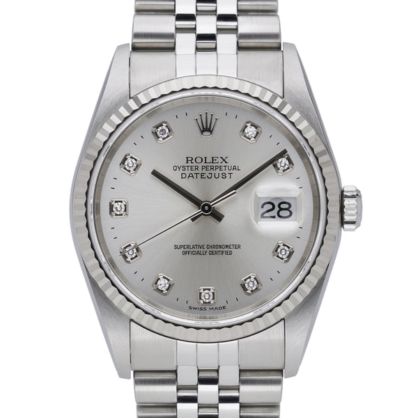 Timeless and versatile, this Rolex Datejust 36 (ref. 16234) pairs a 36mm steel and white gold case with a signature fluted bezel and a refined silver dial set with diamond hour markers. Powered by an automatic movement and protected by a sapphire crystal, it offers 100M water resistance for everyday confidence. The steel Jubilee bracelet with folding clasp completes the classic look. Manufactured in 2002 and presented in good condition, this piece is supplied with its box and backed by our 2 Year Warranty. BQ Ref: 51654. Enjoy Next Day Delivery and a 14 Day Return Policy for complete peace of mind.