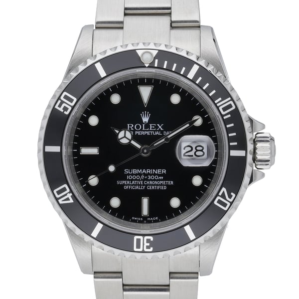 Iconic and enduring, this Rolex Submariner Ref. 16610 (BQ Ref 51658) from 2004 pairs a 40mm Oystersteel case with a matching Oyster bracelet and secure Oysterlock clasp. The black dial sits beneath a scratch-resistant sapphire crystal, framed by a unidirectional rotatable bezel for precise dive timing. Powered by a reliable automatic movement and water resistant to 300M, it’s built for performance and everyday wear. Presented in excellent condition, this example is complete with its Rolex box, original papers, and green tag. Enjoy peace of mind with our 2 Year Warranty, plus a 14 Day Return Policy and Next Day Delivery.
