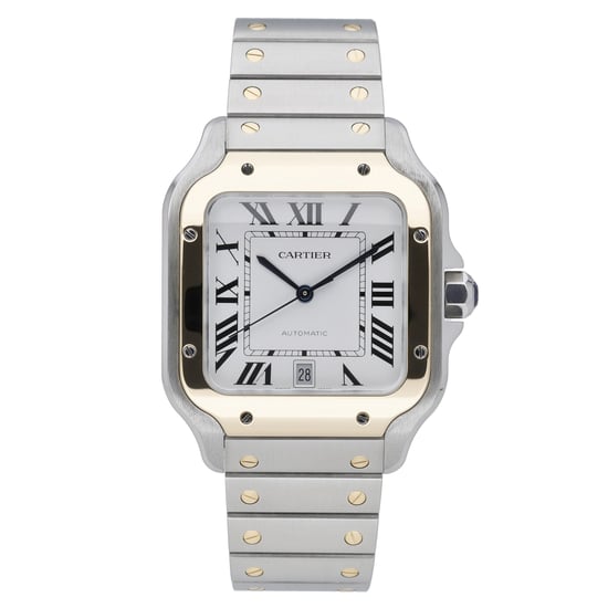 Refined and iconic, this 2017 Cartier Santos (Model 4072) blends steel and yellow gold across its 39mm case and matching bracelet, framed by a smooth bezel and classic white Roman dial beneath scratch-resistant sapphire crystal. Presented in excellent condition, it features a secure folding clasp and 100M water resistance for everyday confidence. This gents Santos is supplied with its box and backed by our 2 Year Warranty, offering a timeless mix of Parisian elegance and reliable performance that transitions seamlessly from business to weekend. Order with confidence: Next Day Delivery and a 14 Day Return Policy. BQ Ref 51650.