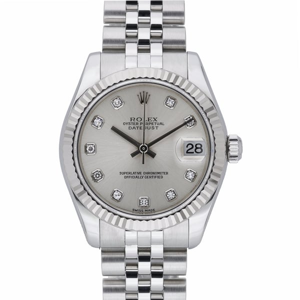 Rolex Datejust 31 (ref. 178274), 2005, in excellent condition. The 31mm steel and white gold case with fluted bezel frames a silver, diamond-set dial protected by sapphire crystal. Powered by a reliable automatic movement and water resistant to 100M, it is fitted with a Jubilee bracelet in Oystersteel and a secure folding clasp for refined everyday wear. Supplied with original box, papers, and white tag, this midsize Datejust is a sophisticated addition to any collection. Backed by our 2 Year Warranty, with next day delivery and a 14 day return policy. BQ Ref 51674.