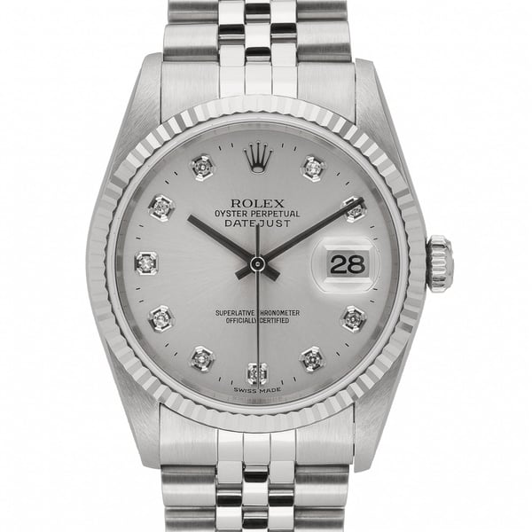 Rolex Datejust 36 (Ref. 16234), BQ Ref 51695. This classic 1996 gents’ model pairs steel and white gold with a fluted bezel for timeless sophistication. Presented in excellent condition, it features a 36mm case, silver diamond-set dial, and scratch‑resistant sapphire crystal. The automatic movement delivers reliable performance, while 100M water resistance adds everyday practicality. Completing the look is a steel and white gold Jubilee bracelet secured by an Oysterclasp for refined comfort. Supplied with its box and a 2-year warranty, plus the reassurance of our 14-day return policy and next day delivery. A distinguished Datejust that blends heritage, elegance, and versatility.
