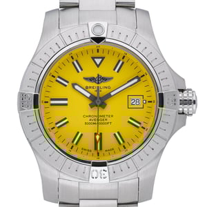 Built for extreme depths and everyday durability, this Breitling Avenger II Seawolf (Ref. A17319, BQ Ref 51662) features a robust 45mm stainless steel case, unidirectional rotatable bezel, and a vivid yellow baton dial protected by scratch-resistant sapphire crystal. Powered by a dependable automatic movement, it is water resistant to an exceptional 3,000M, making it a formidable tool for professional diving. The steel bracelet with folding clasp ensures a secure, comfortable fit. Presented in excellent condition and dated 2022, this gents model is supplied with its original box and papers. Enjoy peace of mind with our 2 Year Warranty, a 14 Day Return Policy, and Next Day Delivery. A striking, high-performance timepiece that embodies Breitling’s signature precision and rugged style.