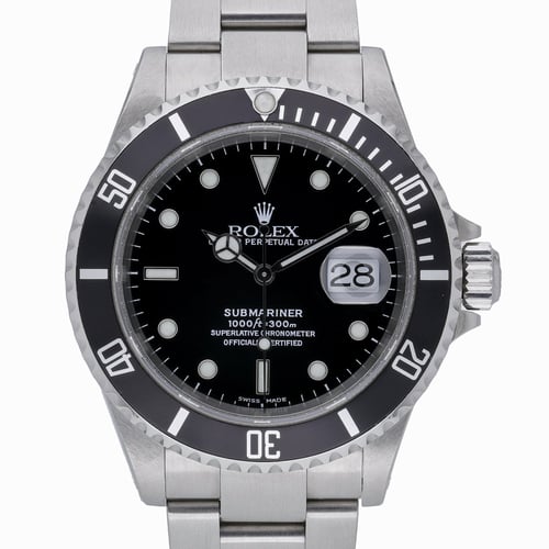 Presenting the Rolex Submariner Ref. 16610 (BQ Ref 51676), a classic 40mm gents diver crafted in Oystersteel with a black dial, unidirectional rotatable bezel, and sapphire crystal. Powered by an automatic movement and fitted to the robust Oyster bracelet with Oysterlock clasp, this 2001 example is in excellent condition and water resistant to 300 meters. Supplied with its original Rolex box, papers, and green tag, it’s a refined choice for both everyday wear and collectors. Enjoy peace of mind with a 2 Year Warranty, a 14 Day Return Policy, and fast Next Day Delivery.